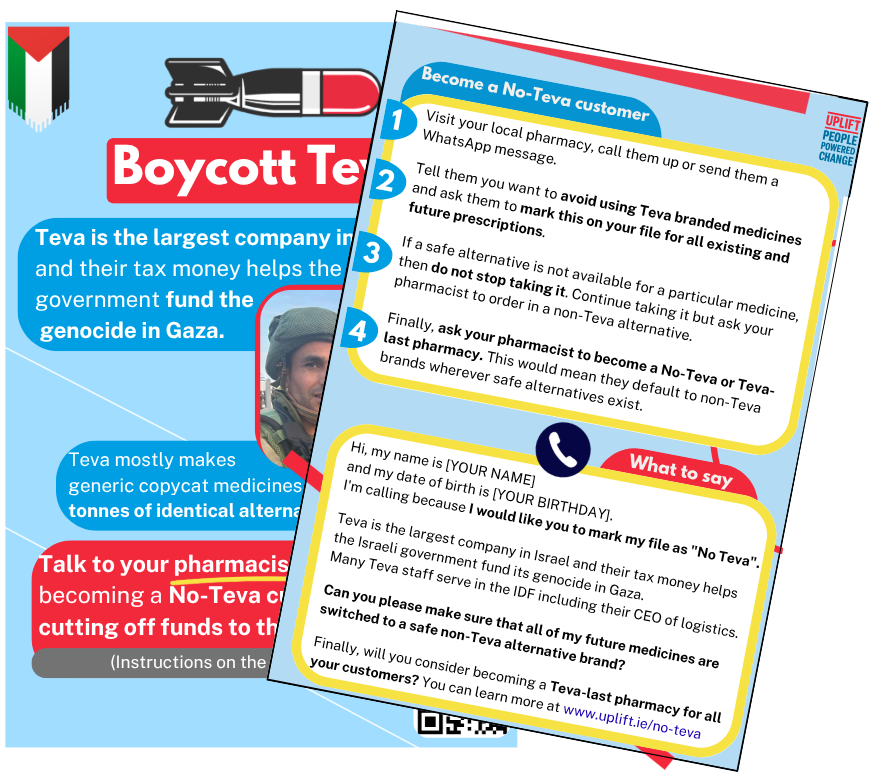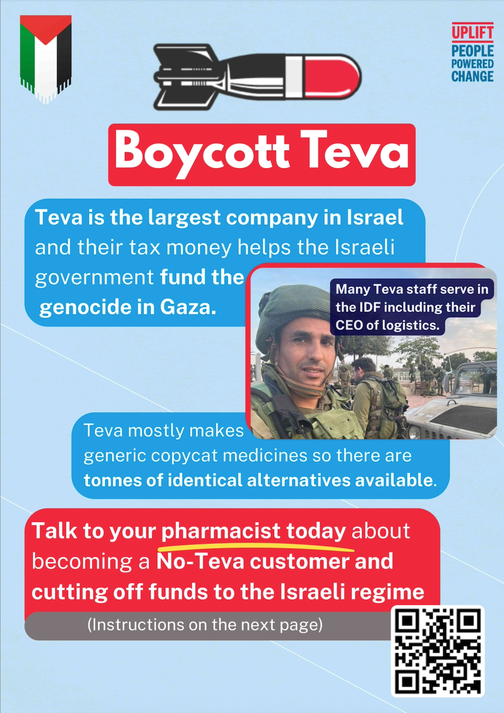 Order your leaflets with information on why to boycott TEVA and what you can do to not use their products. You can share those leaflets with your friends, family or talk with your pharmacist and leave it at the pharmacy.