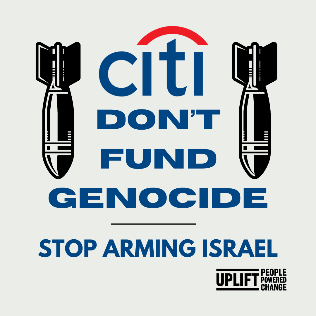 Citi is funding genocide by arming the Israeli army with weapons. It has been warned by a UN panel of experts that it risks complicity in human rights abuses due to its ongoing funding of the Israeli state, but Citibank's bosses are sitting quiet about it.